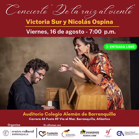 El Centro Cultural del Banco de la República en Barranquilla, presenta el concierto De la raíz al viento a cargo del dúo colombiano 🇨🇴 conformado por Nicolás Ospina en el piano 🎹 y la talentosa cantante Victoria Sur 💃🏽🎙️. Esta actividad se lleva a cabo en el marco de la Temporada Nacional de Conciertos del