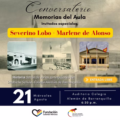 La Fundación Colombo Alemana de Barranquilla, en estrecha colaboración con el Colegio Alemán de Barranquilla, se complace en invitar a toda la comunidad educativa, exalumnos, y amigos a un evento muy especial: el conversatorio “Memorias del Aula”. Tendremos el privilegio de contar con la participación de dos destacados invitados: Severino Lobo y Marlene De Alonso.
