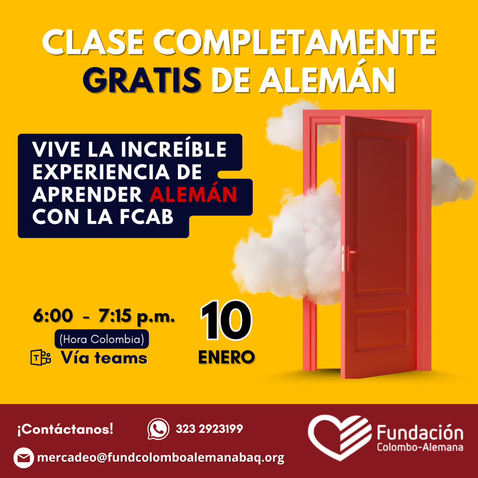 ¡Conviértete en un estudiante FCAB! Disfruta de 6:00 a 7:15 p.m (hora Colombia), nuestra sesión Puertas Abiertas. Únete a una clase virtual de alemán completamente gratis a través de la plataforma Teams. ¡No te lo puedes perder! 🤩 Conéctate y vive la increíble experiencia de aprender alemán con la Fundación Colombo-Alemana de Barranquilla. En la