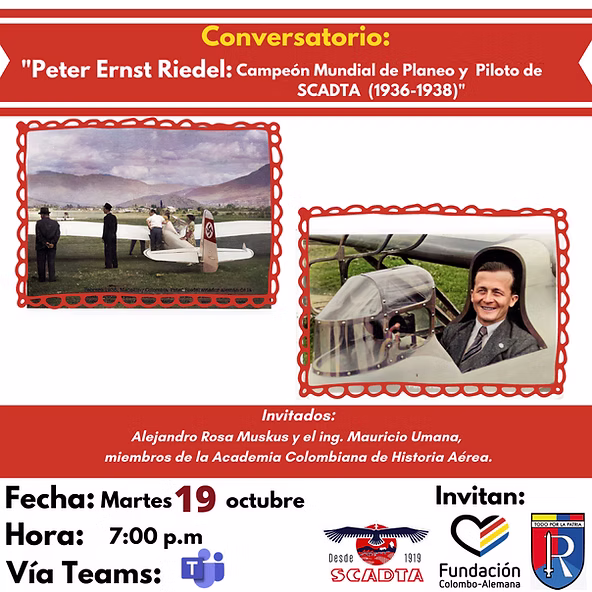 Conversatorio: “Peter Ernst Riedel:Campeón Mundial de Planeo y Piloto de SCADTA (1936-1938)” En este evento cultural a cargo de los miembros de la Academia Colombiana de la historia aérea Alejandro Rosa Muskus y Mauricio Umana, conoceremos la vida y obra de Peter Ernst Riedel, el Campeón Mundial de Planeo y Piloto de Scadta entre los