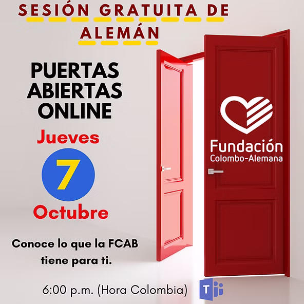 ¡Aprende alemán online con uno de nuestros 20 docentes en vivo gratis! Ya están abiertas la inscripciones para #puertasabiertasonline Conéctate con nosotros el jueves 7 de octubre a una sesión completamente gratis de nuestros cursos de alemán online. Durante una hora y quince minutos, podrás vivir la experiencia de un estudiante de alemán FCAB; conocerás
