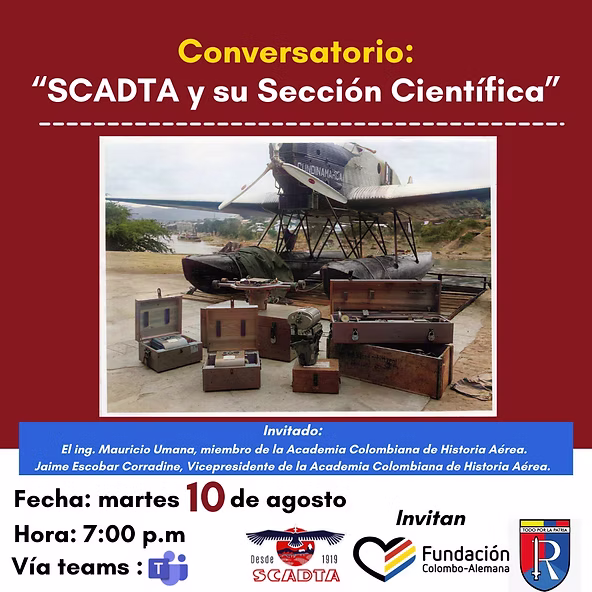 La Fundación Colombo-Alemana de Barranquilla, La Sociedad Colombo-Alemana de Transportes Aéreos y la Reserva Naval de Colombia, te invitan a participar del conversatorio: “SCADTA y su Sección Científica” Los conferencistas Mauricio Umana, miembro de la Academia Colombiana de Historia Aérea, y Jaime Escobar Corradine, Vicepresidente de la Academia Colombiana de Historia Aérea, contarán uno de
