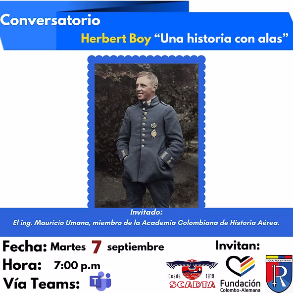Conversatorio: Herbert Boy “Una historia con alas” En este evento cultural a cargo del conferencista Mauricio Umana, miembro de la Academia Colombiana de la historia aérea, conoceremos la vida y obra de Herbert Boy, el alemán que en 1924 se integró a SCADTA, y en ese mismo año fue nombrado jefe de aviador; Herbert fue