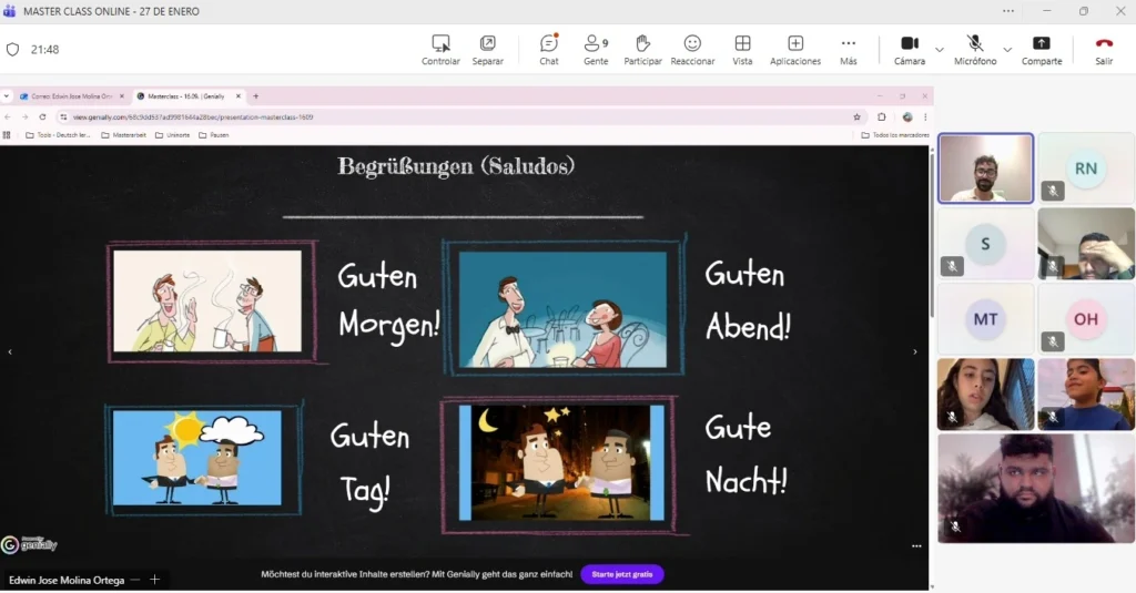 La sesión fue conducida por el docente Edwin Molina, quien desarrolló una clase interactiva en la que se realizaron diversos ejercicios prácticos, haciendo especial énfasis en la importancia de la fonética del alemán como base fundamental para una correcta pronunciación y comprensión del idioma desde las primeras etapas de aprendizaje.
